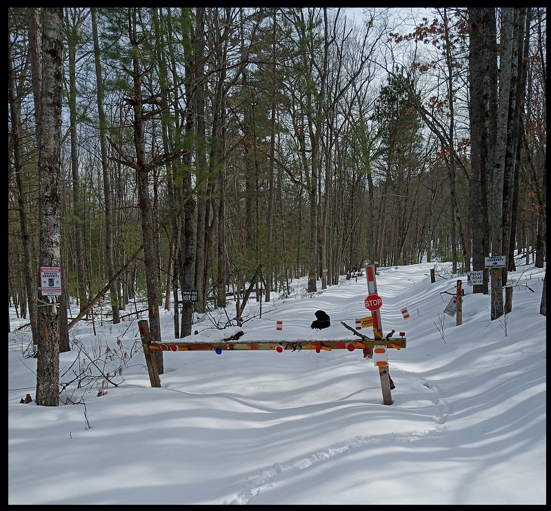 It was pretty warm that day, in the upper 40's. The snow was soft and mushy so the sled was sinking down in a bit, making for some strenuous exercise. We reached the halfway point, crossing onto private land...