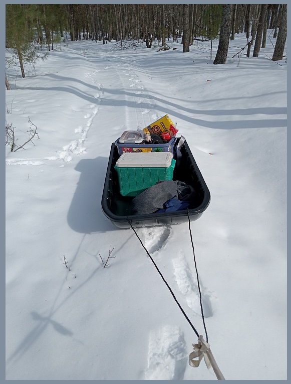I dragged all the necessary - and some not so necessary - provisions in on a sled. It's not a long haul, just a bit less than three quarters of a mile...
